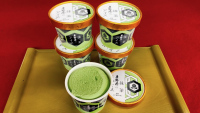 包丁で半分に切ると、中には抹茶アイスが!